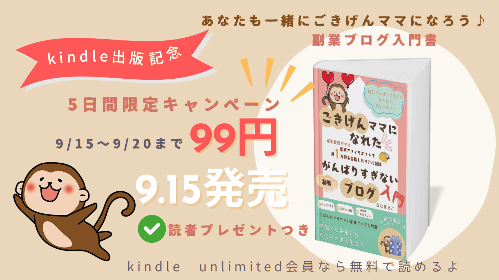 >>kindle「ごきげんママになれた!がんばりすぎない副業ブログ入門: ~元不登校ママの楽天アフィリエイトで月1万円を目指したリアル実践記~」